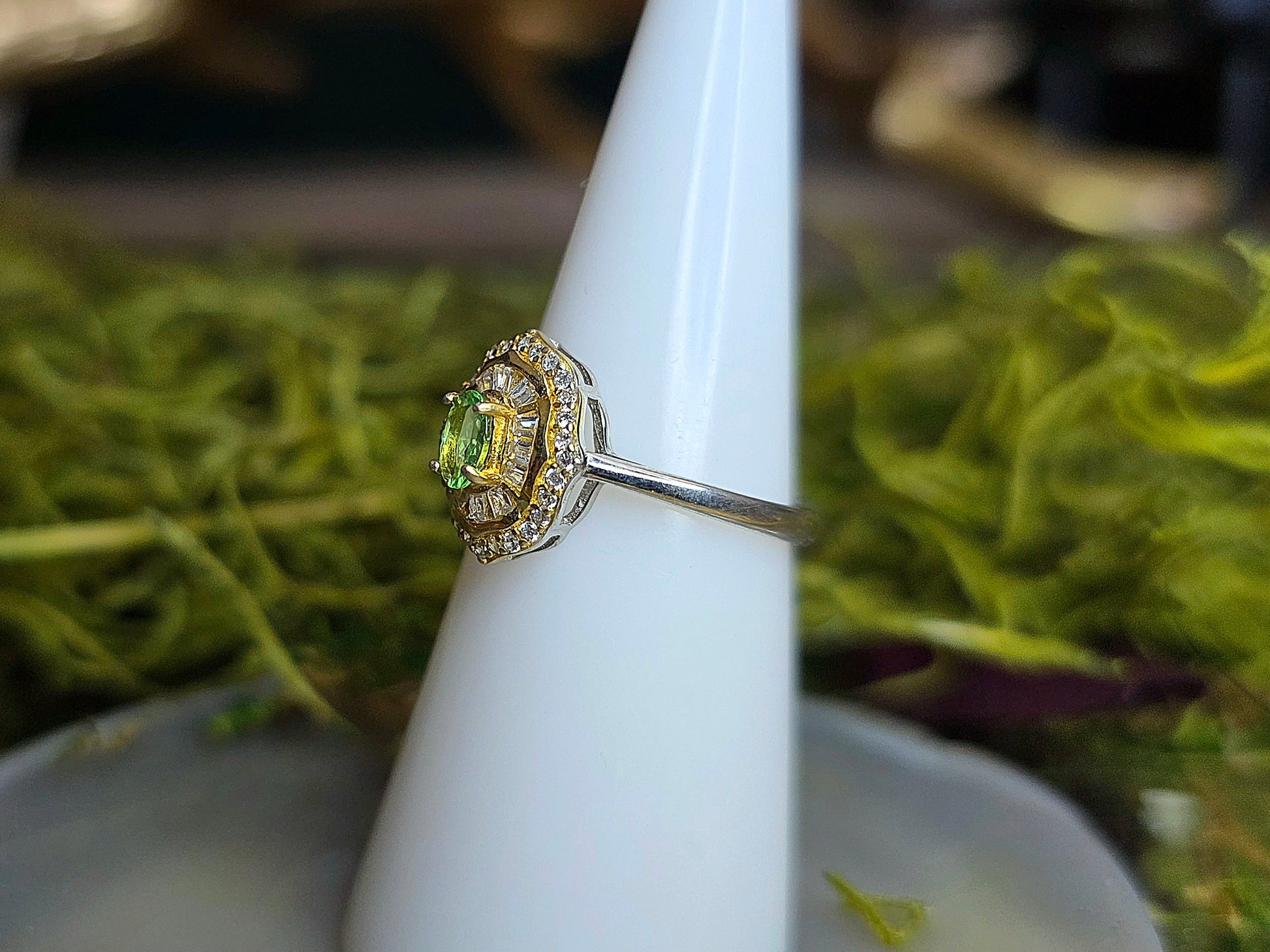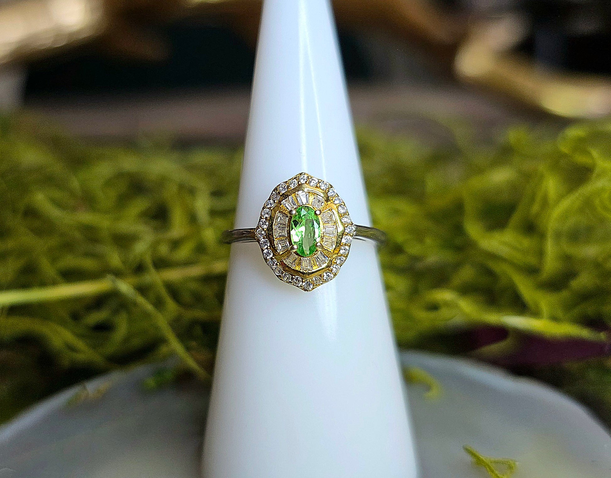Tsavorite is a rare, green variety of garnet. It's a calcium aluminum silicate that gets its color from trace amounts of chromium and vanadium. British geologist Campbell R. Bridges discovered tsavorite in 1967 in the Simanjiro District of Tanzania, abd he discovered a second deposit in Kenya four years later, which led to the first commercially viable mine opening in 1974.