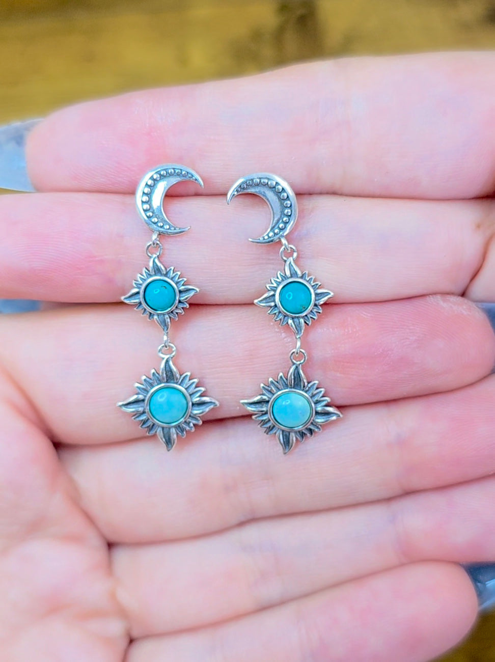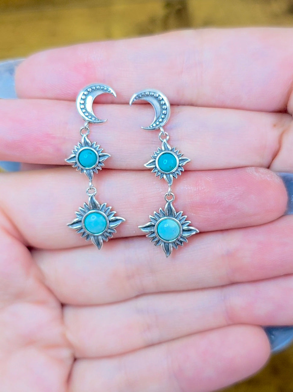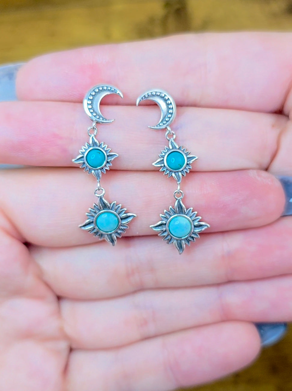 These post earrings feature four turquoise cabochons, two 3.5mm and two 4.5mm. They are sterling silver srt with a double sun and moon design.