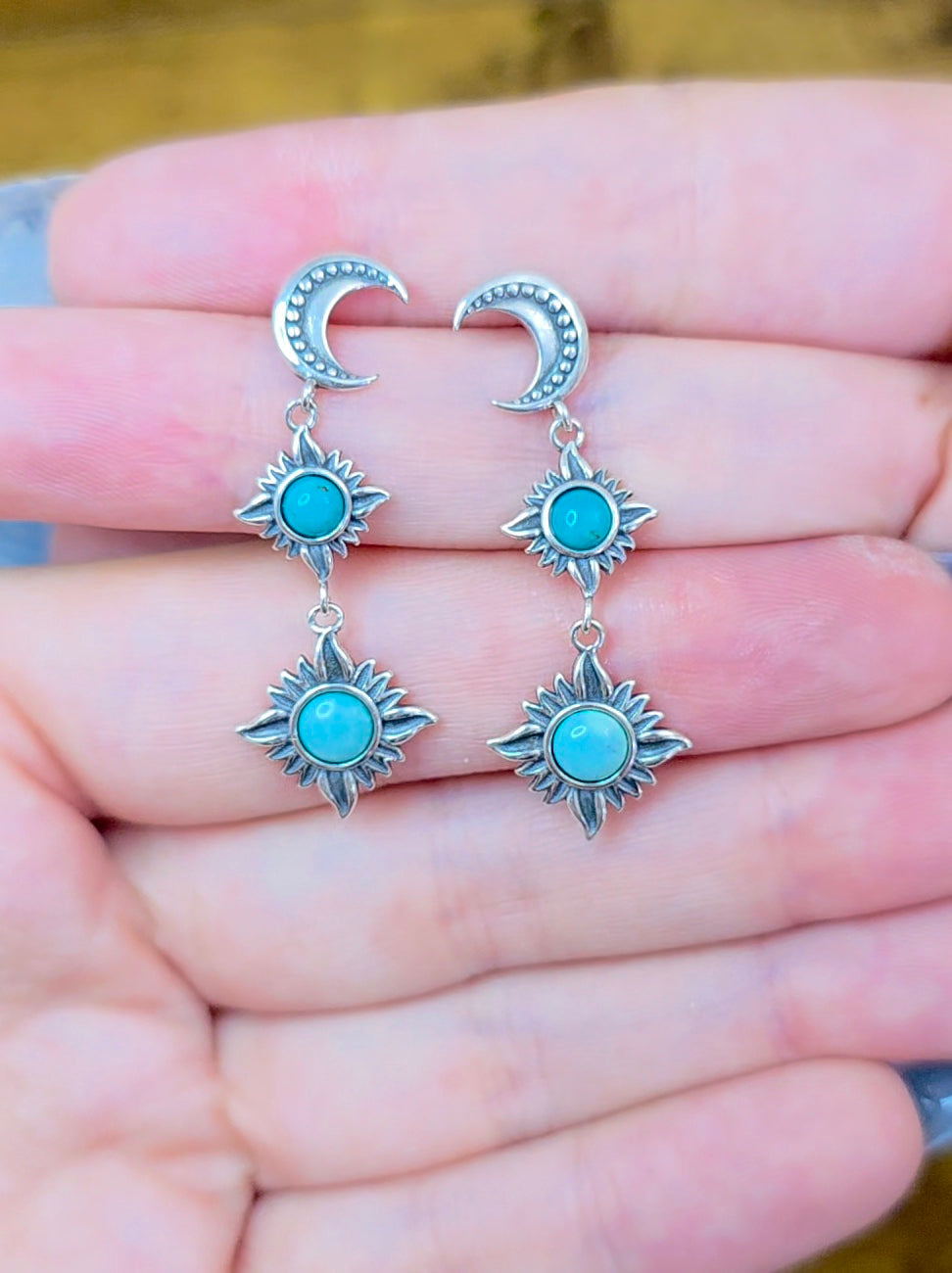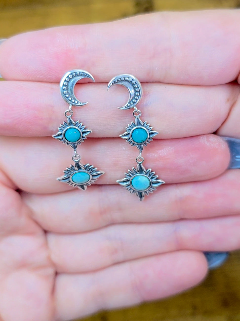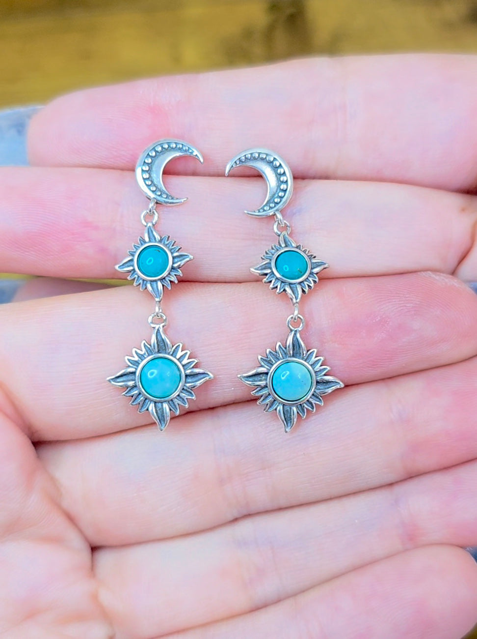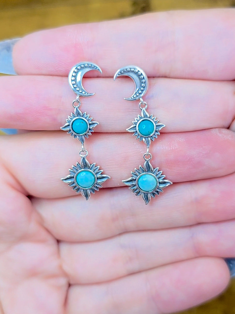 These post earrings feature four turquoise cabochons, two 3.5mm and two 4.5mm. They are sterling silver srt with a double sun and moon design.
