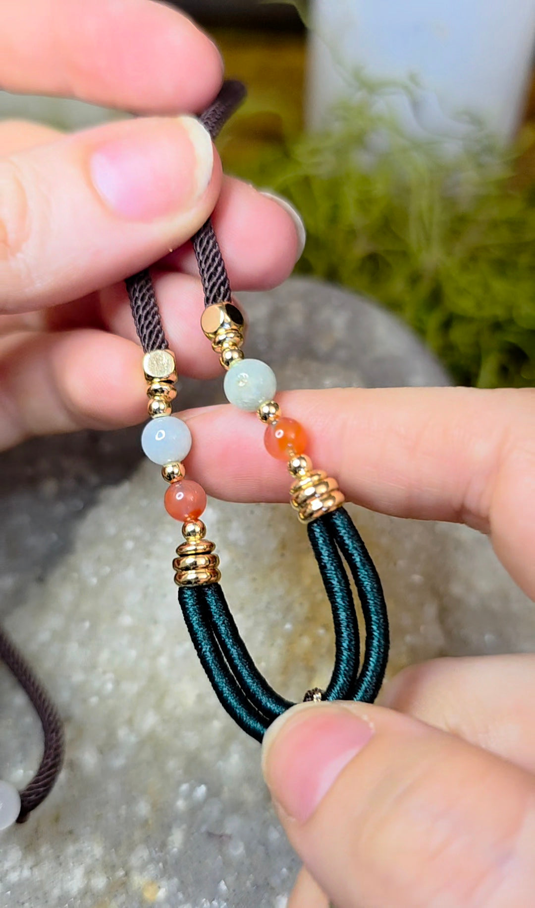 This pendant features two tone green jadeite that has been hand carved into the shape of a snake. It is set onto an adjustable 26" nylon cord with jadeite and carnelian accent beads.