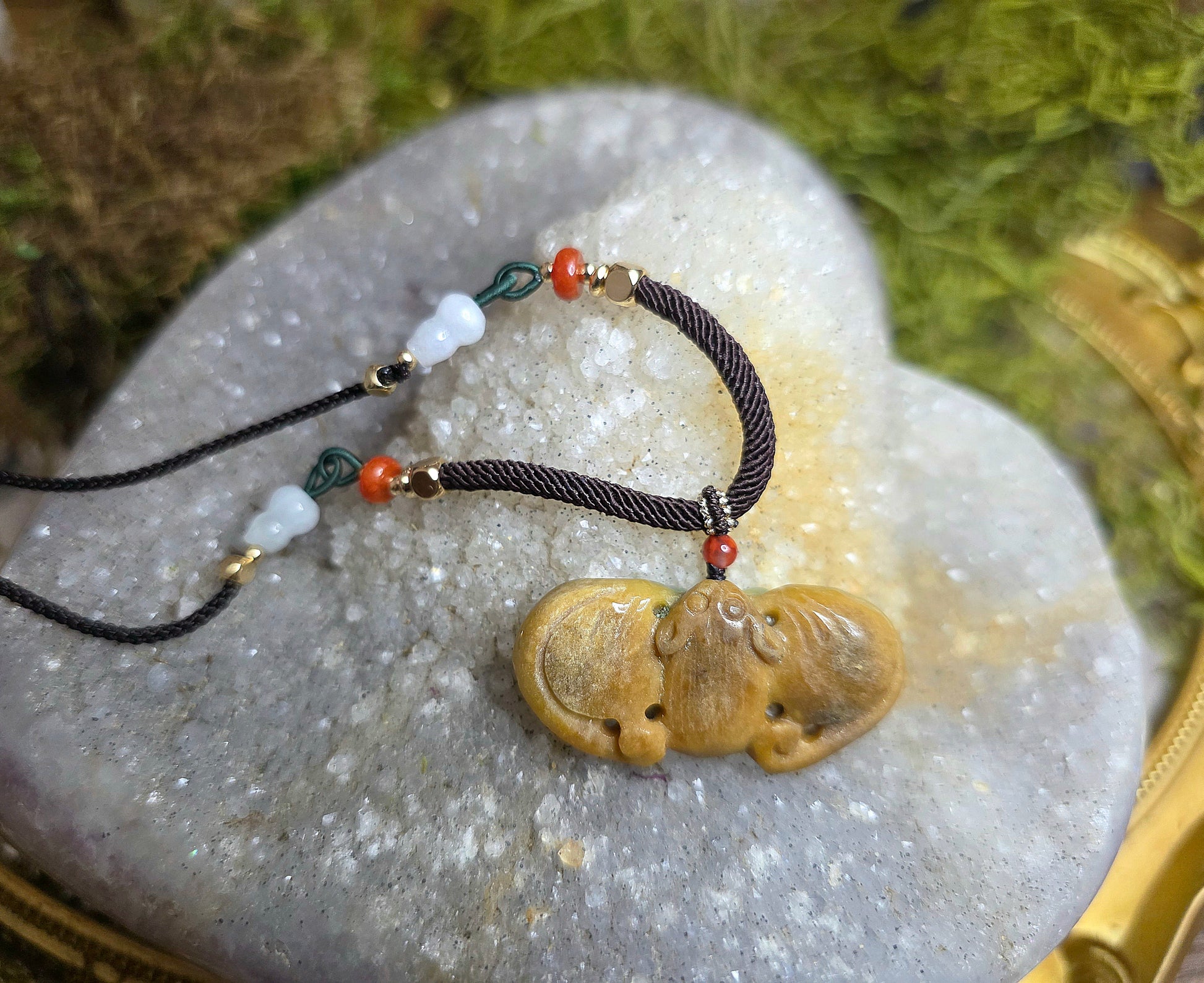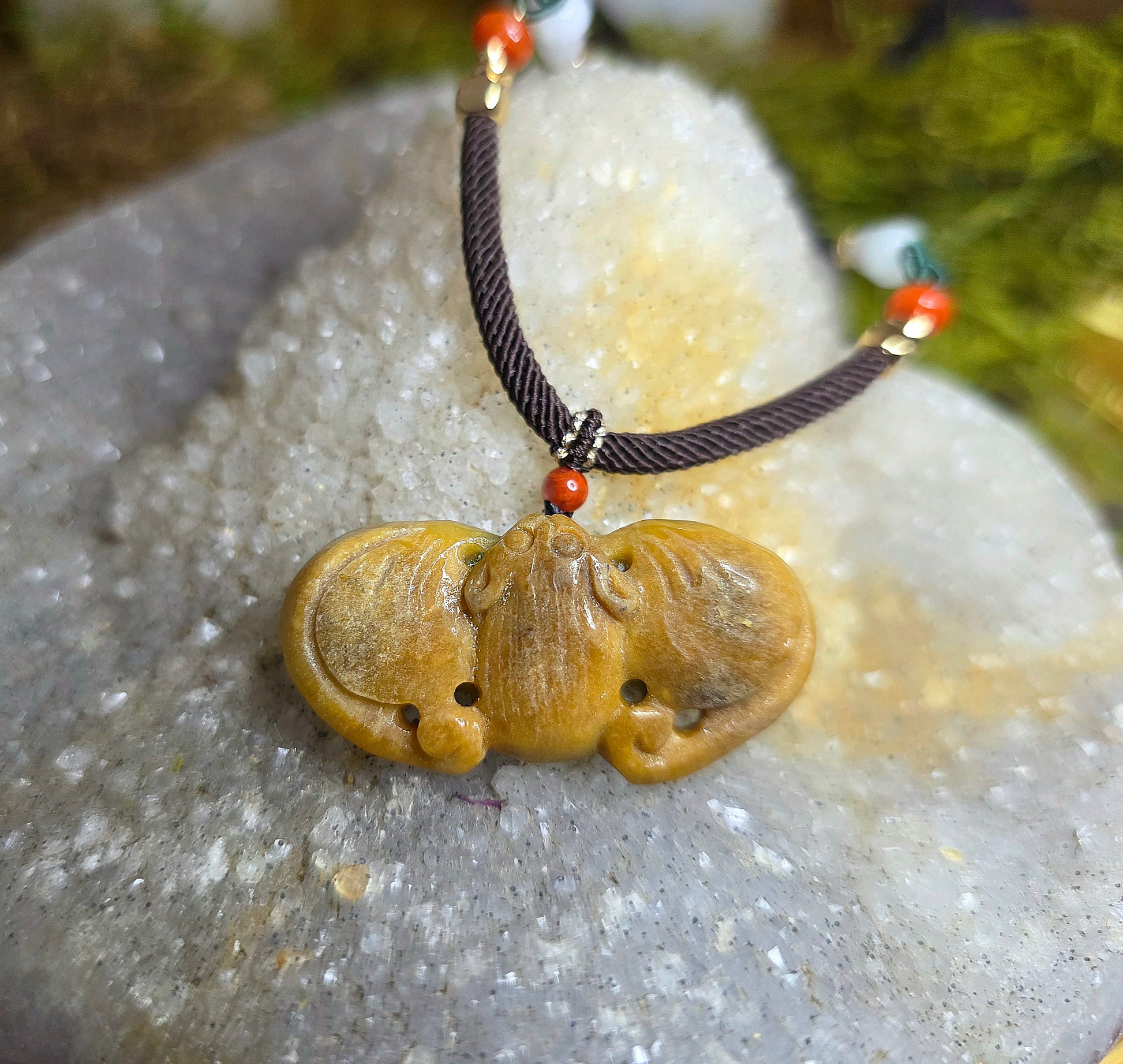 This pendant features yellow and green jadeite that has been hand carved into the shape of a bat. It is set onto an adjustable 26" nylon cord with jadeite and carnelian accent beads.