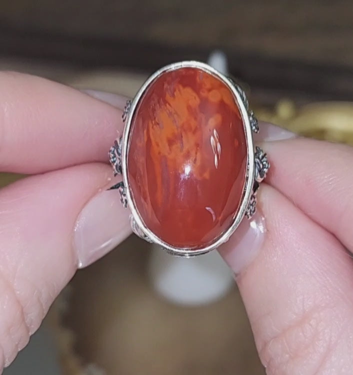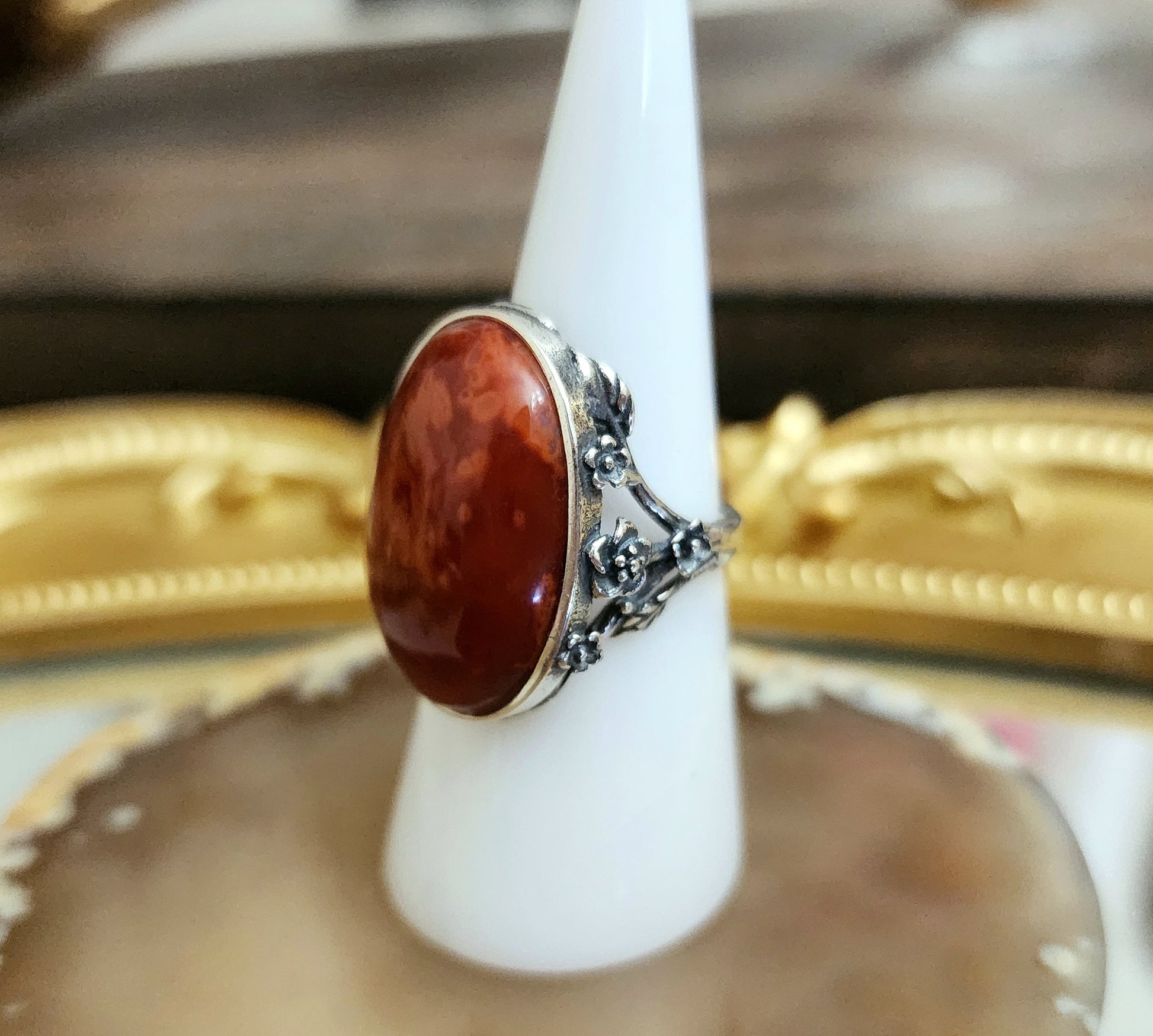 This large cabochon set into an adjustable sterling silver ring that features flower and vine details