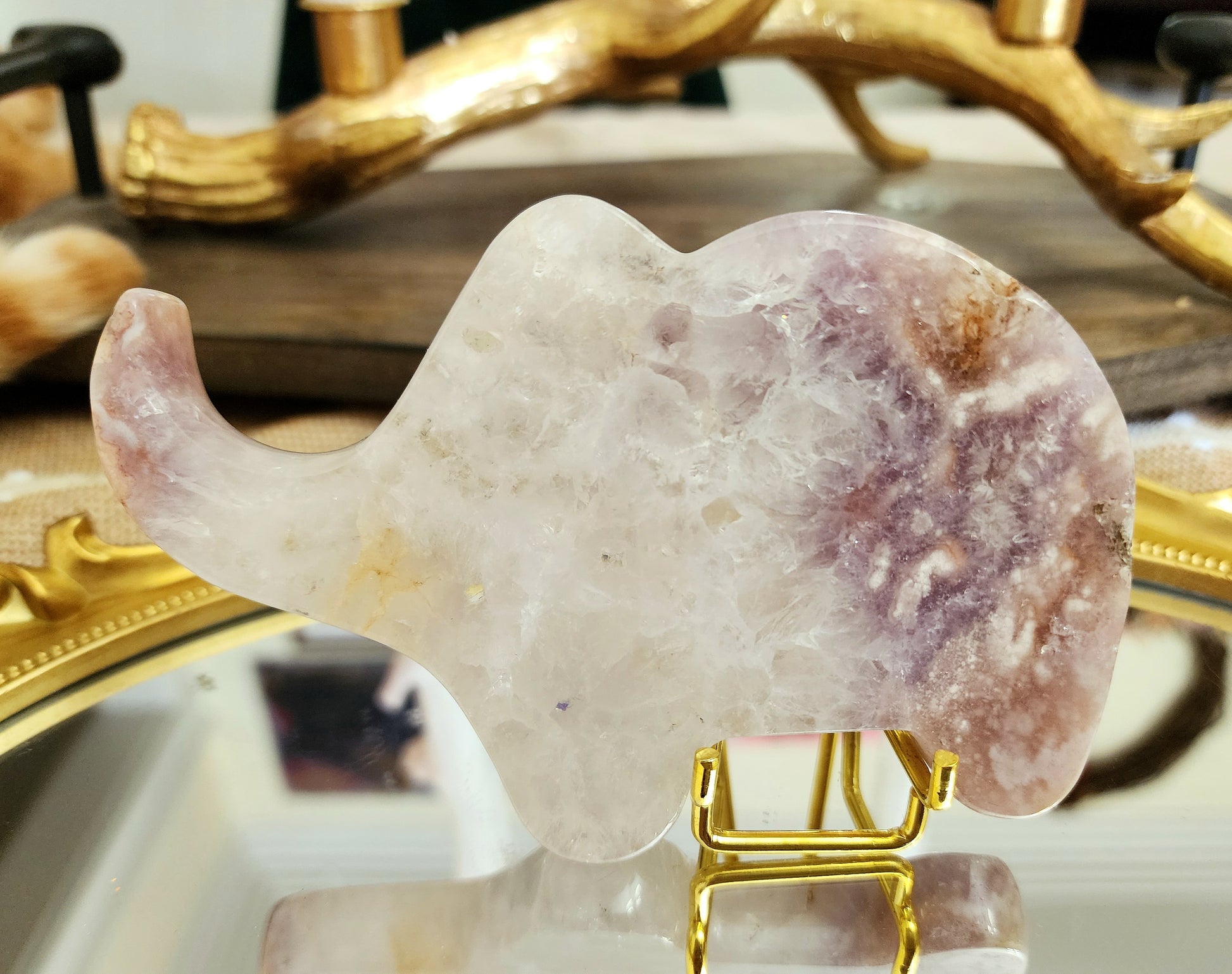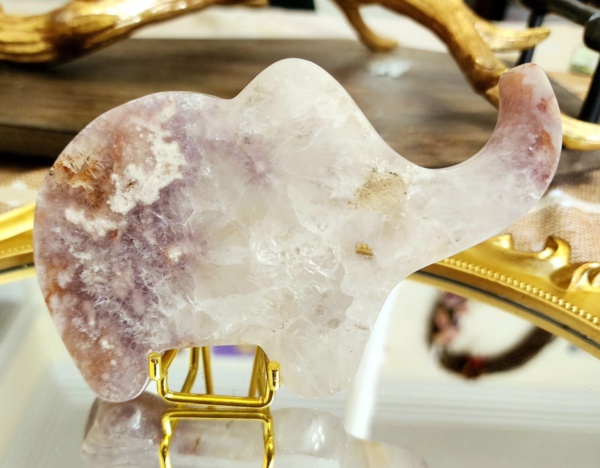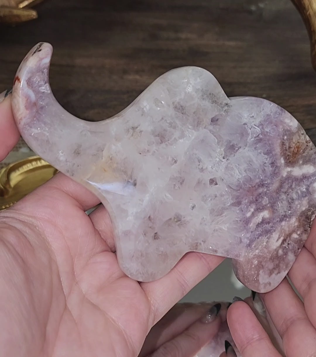 Beautiful purple amethyst and pink flower agate full of quartz and blooms. Carved into the shape of an elephant.