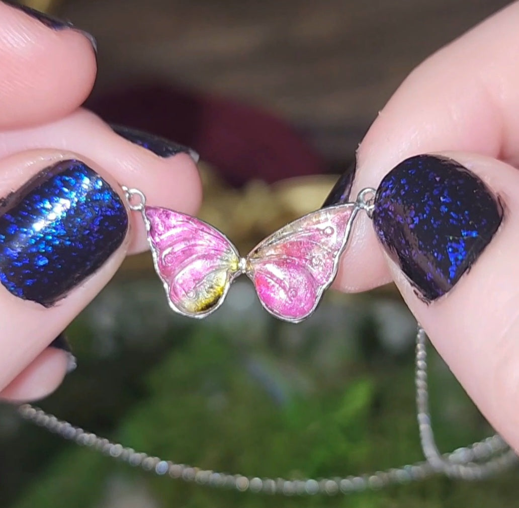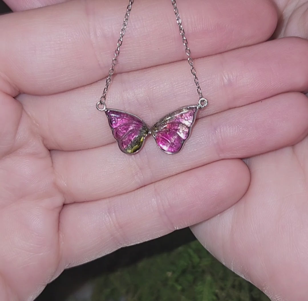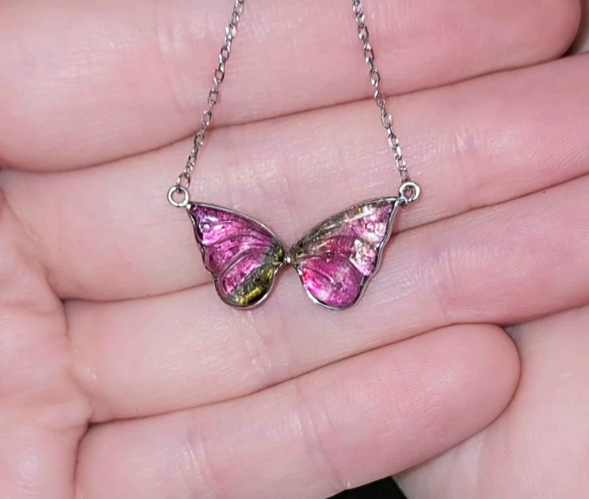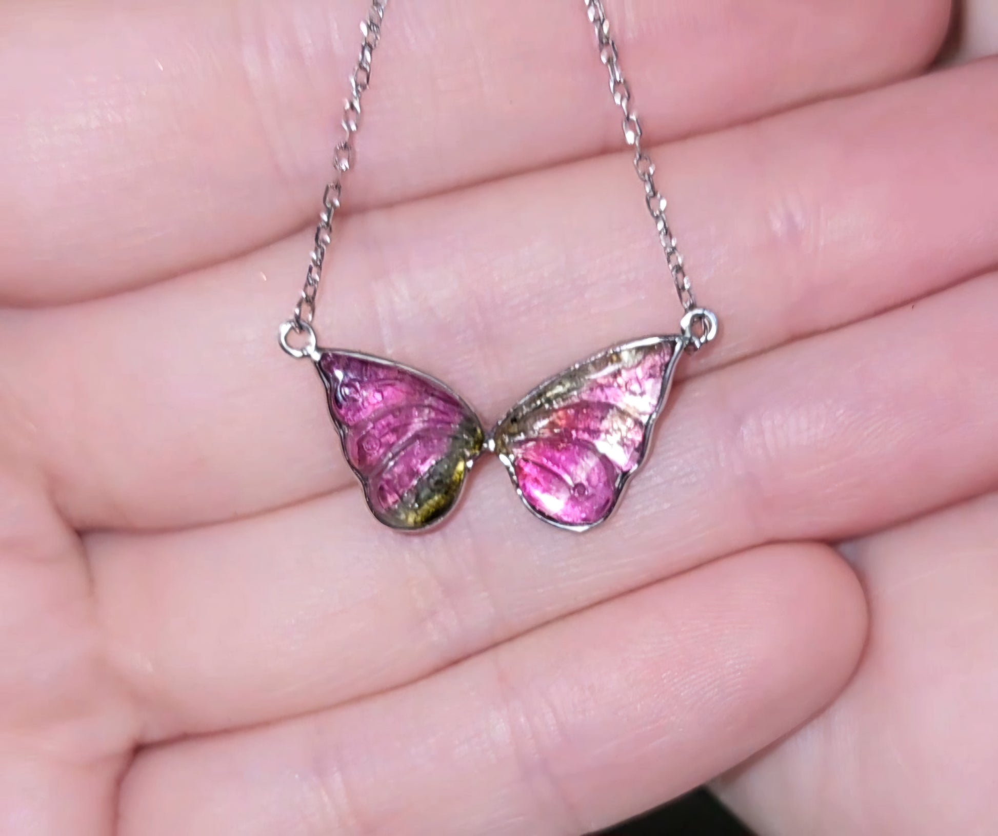 Hand carved watermelon tourmaline with shades of pink and green set into a sterling silver pendant with a delicate sterling silver chain.