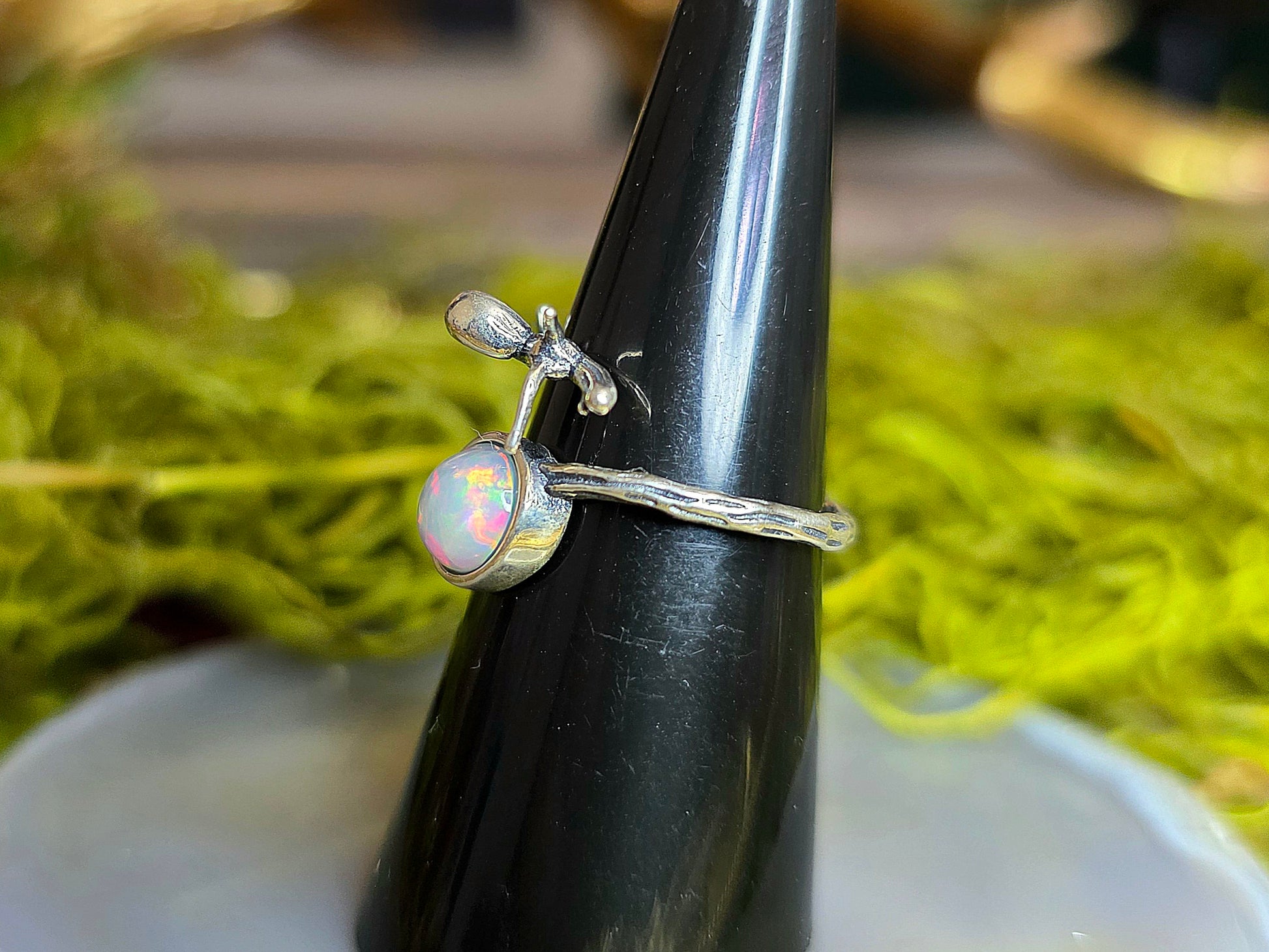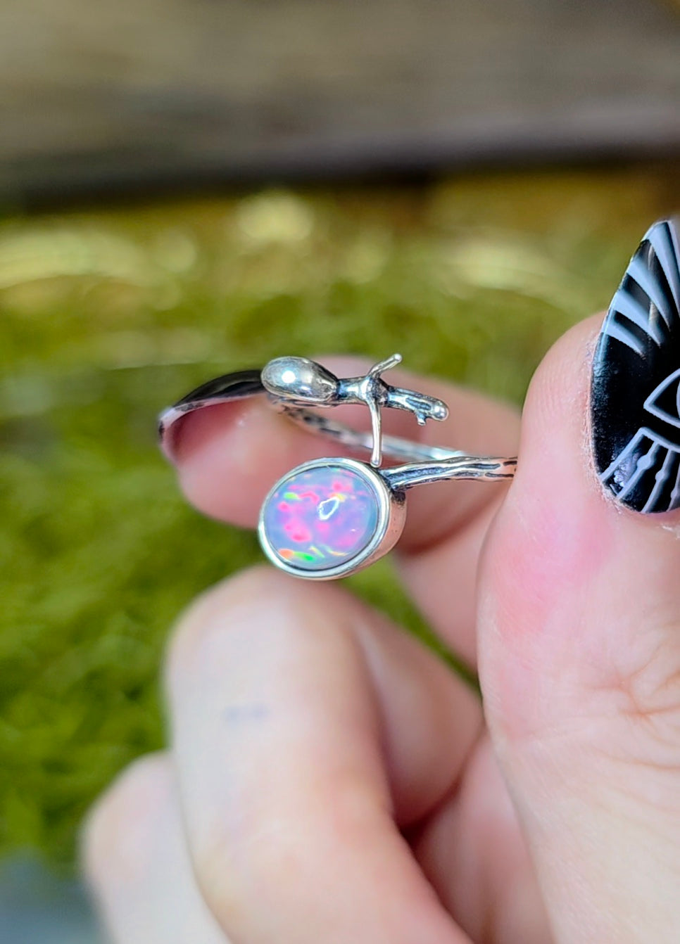 9x6.5mm white honeycomb opal cabochon set into an adjustable sterling silver ring with a snail design.