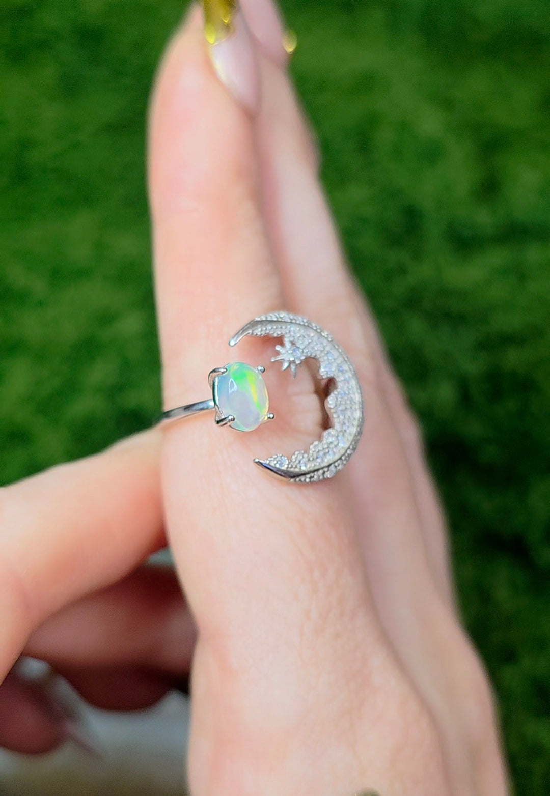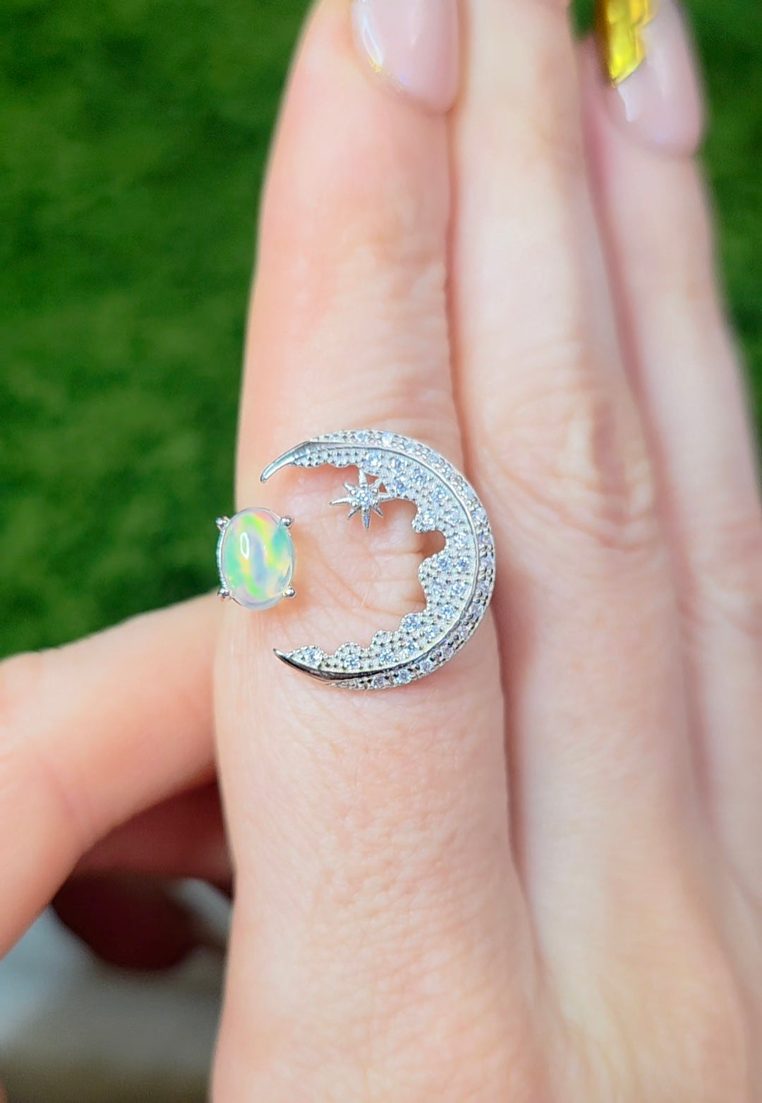 7x5mm white opal cabochon crystal with multicolor flash set into an adjustable sterling silver ring with zircon accent stones.
