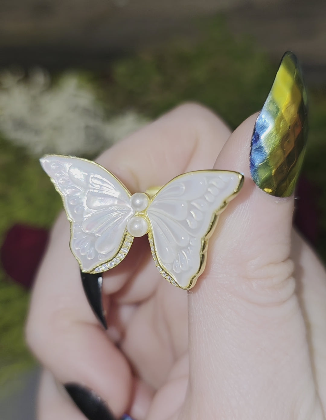 Iridescent white shell hand carved into 2 butterfly wings with a span of 33mm. The wings set into an adjustable gold plated sterling silver ring with zircon and faux pearl accents