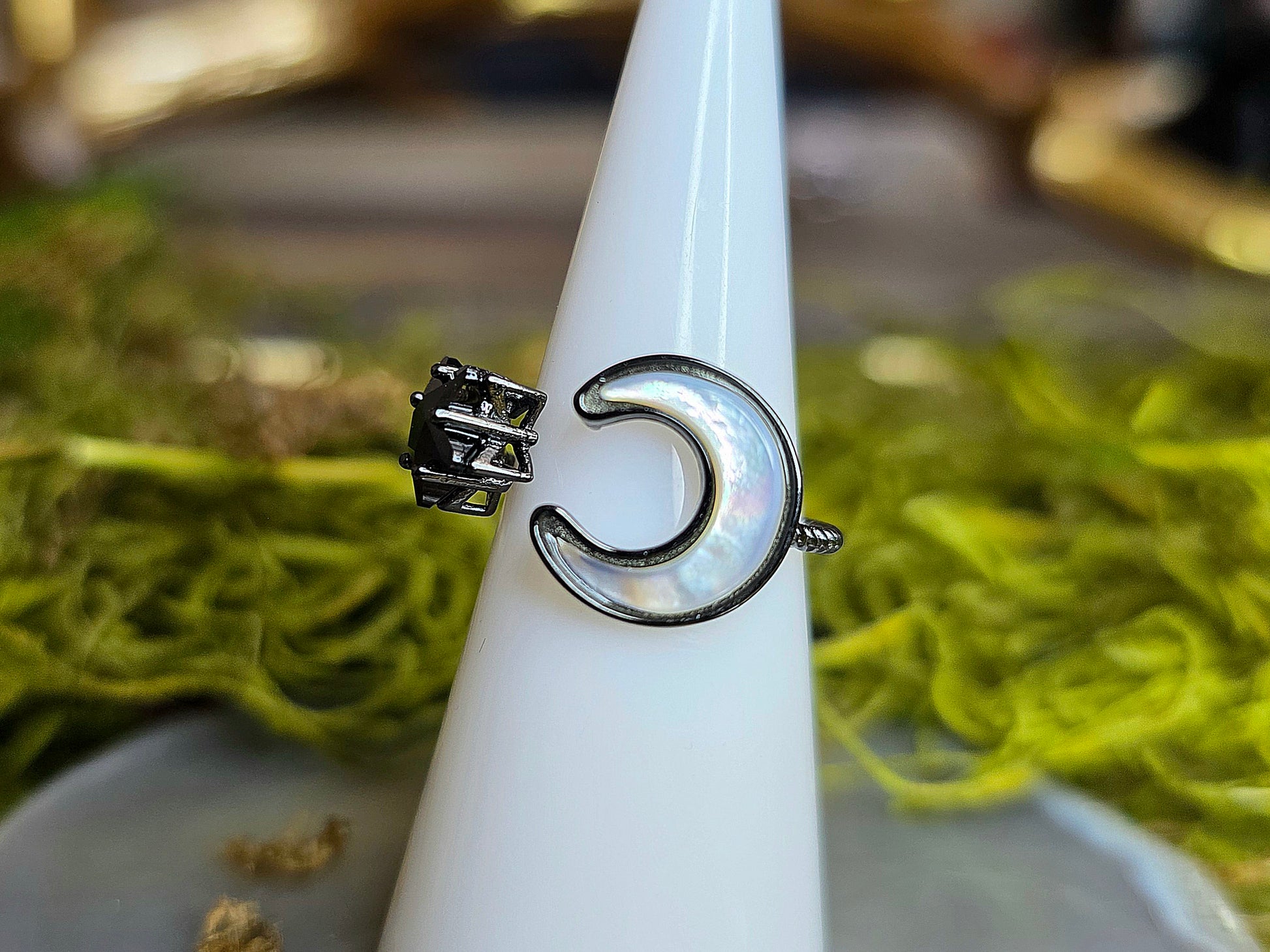 12mm iridescent white shell carved into the shape of a crescent moon and an 8mm faceted black spinel crystal set into an adjustable black sterling silver ring.